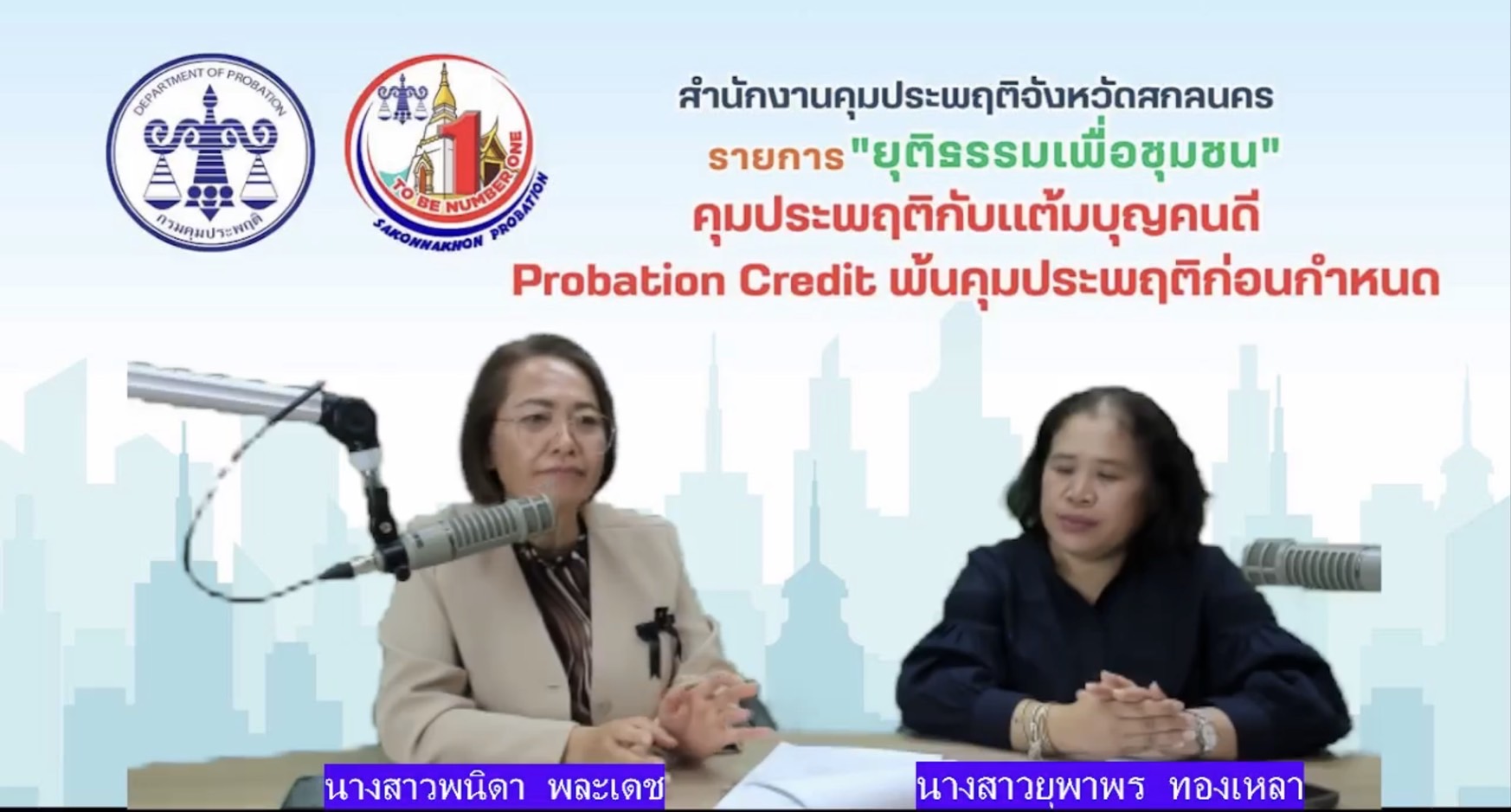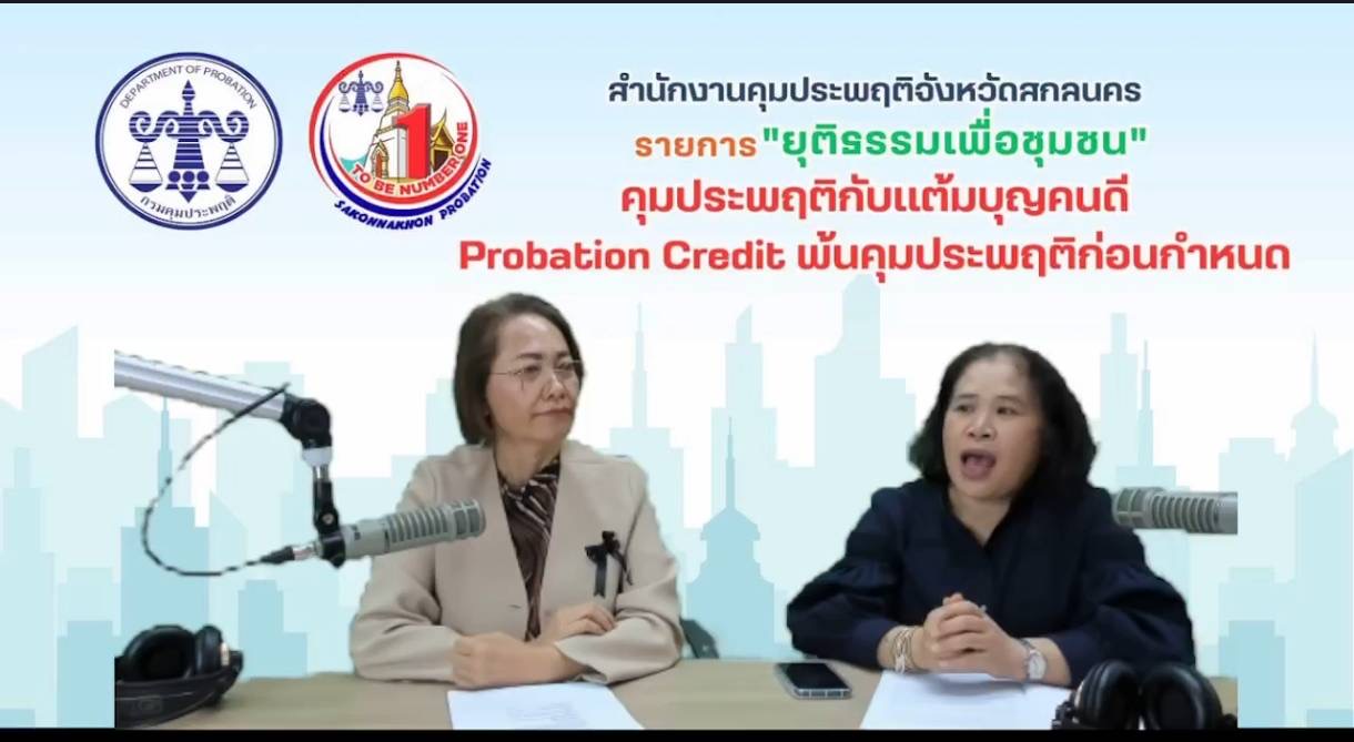 วันนี้ 12 กุมภาพันธ์ 2569 เวลา 17.00-18.00 นาฬิกา นางสาวสายฝน จันทะพรม ผู้อำนวยการสำนักงานคุมประพฤติจังหวัดสกลนคร มอหมาย นางสาวพนิดา พละเดช รองผู้อำนวยการสำนักงานคุมประพฤติจังหวัดสกลนคร และนางสาวยุพาพร ทองเหลา พนักงานคุมประพฤติชำนาญการ กลุ่มยุทธศาสตร์การคุมประพฤติ สำนักงานคุมประพฤติจังหวัดสกลนคร จัดรายการ "ยุติธรรมเพื่อชุมชน" ในหัวข้อ "คุมประพฤติกับแต้มบุญคนดี Probation Credit พ้นคุมประพฤติก่อนกำหนด" ผ่าน สวท.สกลนคร FM 91.25 MHz